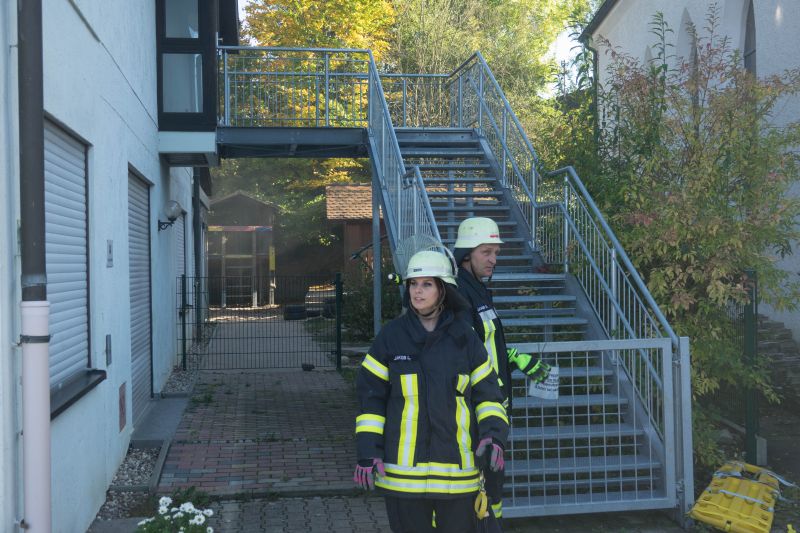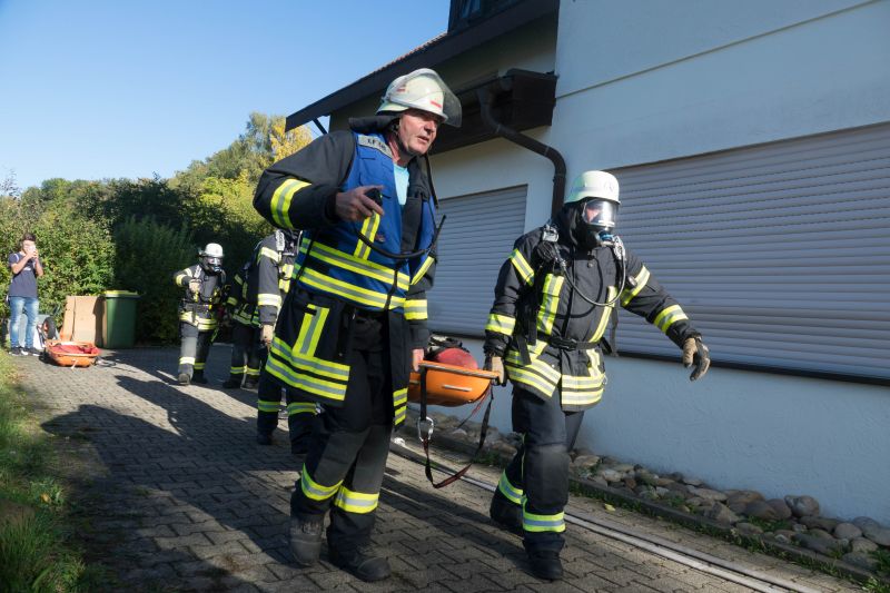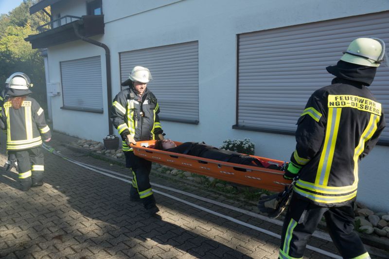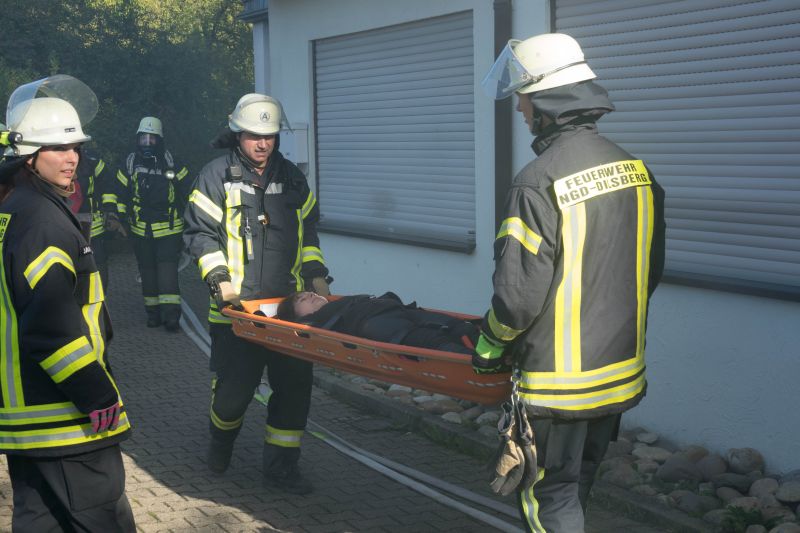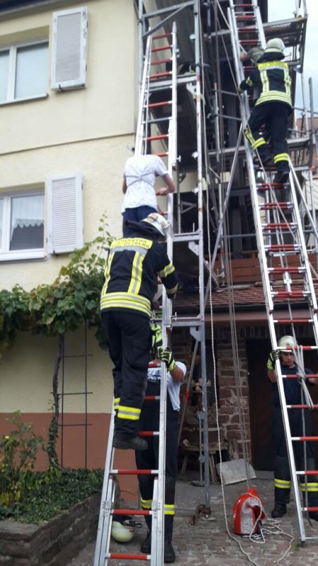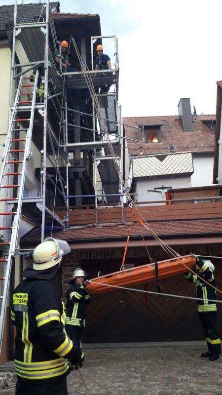 Die Aufgabe der Übung bestand darin, neben dem Aufbau eines Löschangriffs auch mehrere verletzte Personen von einem Gerüst zu retten.