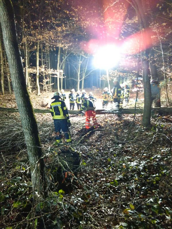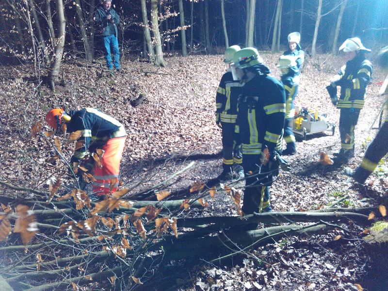 Das Thema der Übung war ein Waldunfall - eine Person wurde bei Baumfällarbeiten unter einem Baum eingeklemmt. Vor Ort fand der Gruppenführer einen Waldarbeiter vor, der ihm von dem Geschehen berichtete und ihm die Unfallstelle zeigte. Der direkte Weg zum Unfallort war durch einen weiteren gefällten Baum versperrt. Es wurde nun die verletzte Person von der Feuerwehr betreut, Beleuchtung aufgebaut, sowie ein Bereitstellungsraum geschaffen.