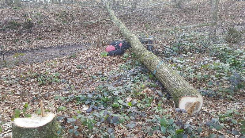 Nun konnte der Patient vorsichtig mit Hilfe des SpineBoards unter dem Stamm hervorgezogen und schonend abtransportiert werden. Der Auftrag der zweiten Gruppe war, den Weg für den Abtransport des Patienten freizumachen, hier wurde der Umgang mit der Kettensäge geübt bzw. gefestigt.