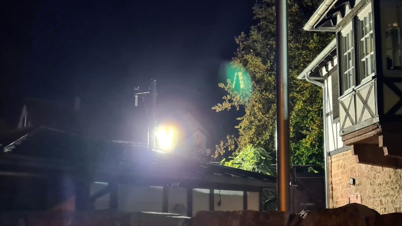 Unsere Fahrzeughalle diente bei der heutigen Übung als Hobbywerkstatt, in der bei angenommenen Schweißarbeiten ein PKW in Brand geriet. Auf der Rückseite des Gebäudes schlugen die fiktiven Flammen aus den Fenstern, so dass auch dort neben der Beleuchtung noch ein Löschangriff aufgebaut wurde.