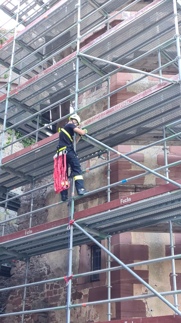 An einem Baugerüst übte die Gruppe Absturzsicherung den sicheren Vorstieg mit verschiedenen Praktiken.