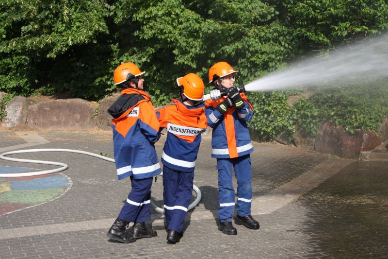 Hier wurde in Rollenspielen das Absetzen eines Notrufes geübt, es wurde die persönliche Schutzausrüstung eines Feuerwehrangehörigen erklärt und die Kinder konnten in praktischen Versuchen sehen, wie sich verschiedene Stoffe von Kleidungsstücken im Kontakt mit Feuer verhalten.